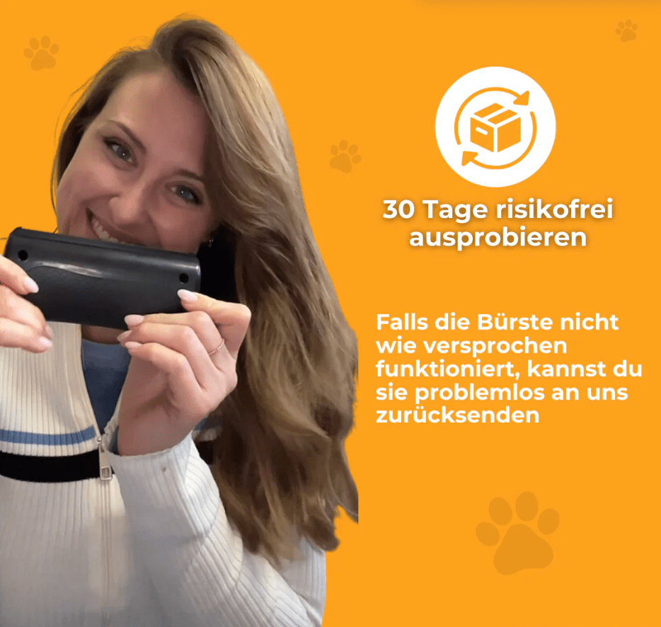 Wenn die Fellwunder Bürste bei deinem Haustier nicht wie versprochen funktioniert, kannst du sie 30 Tage lang risikofrei testen. Solltest du mit dem Ergebnis nicht zufrieden sein, bieten wir dir eine Geld-zurück-Garantie.